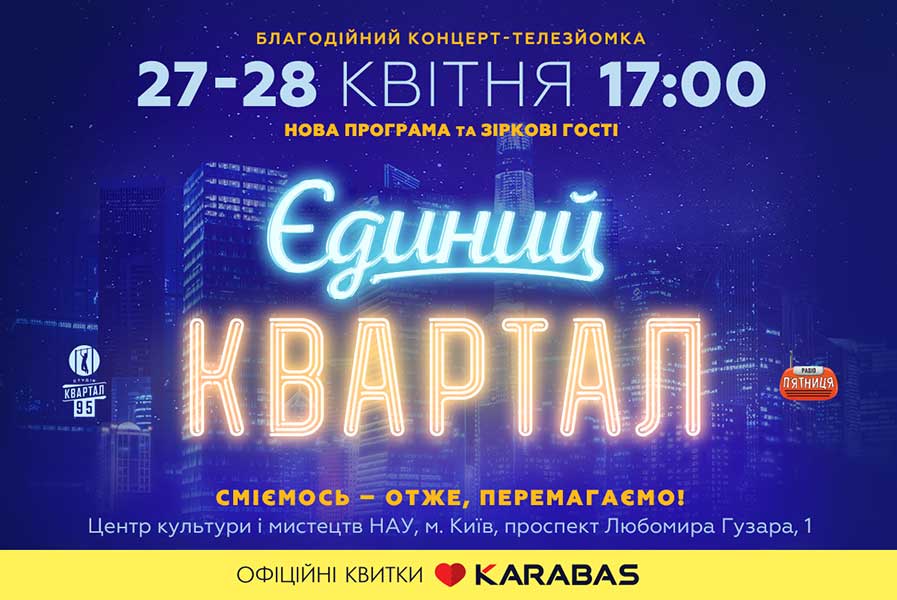 27 та 28 квітня у Києві в Центрі культури і мистецтв НАУ відбудеться телезйомка великих благодійних концертів «Єдиного Кварталу».